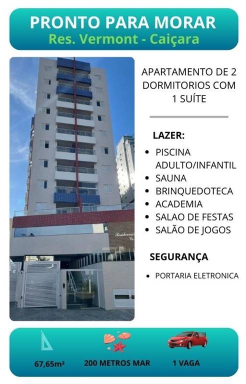 RESIDENCIAL VERMONTBem vindo ao mais novo residencial no bairro no Caiçara com exelente localização, e proximo de serviços exclusivos no bairro que mais cresce no litoral.Apartamento de 2 dormitorios com 1 suite e saida para a sacada, sala para dois ambie